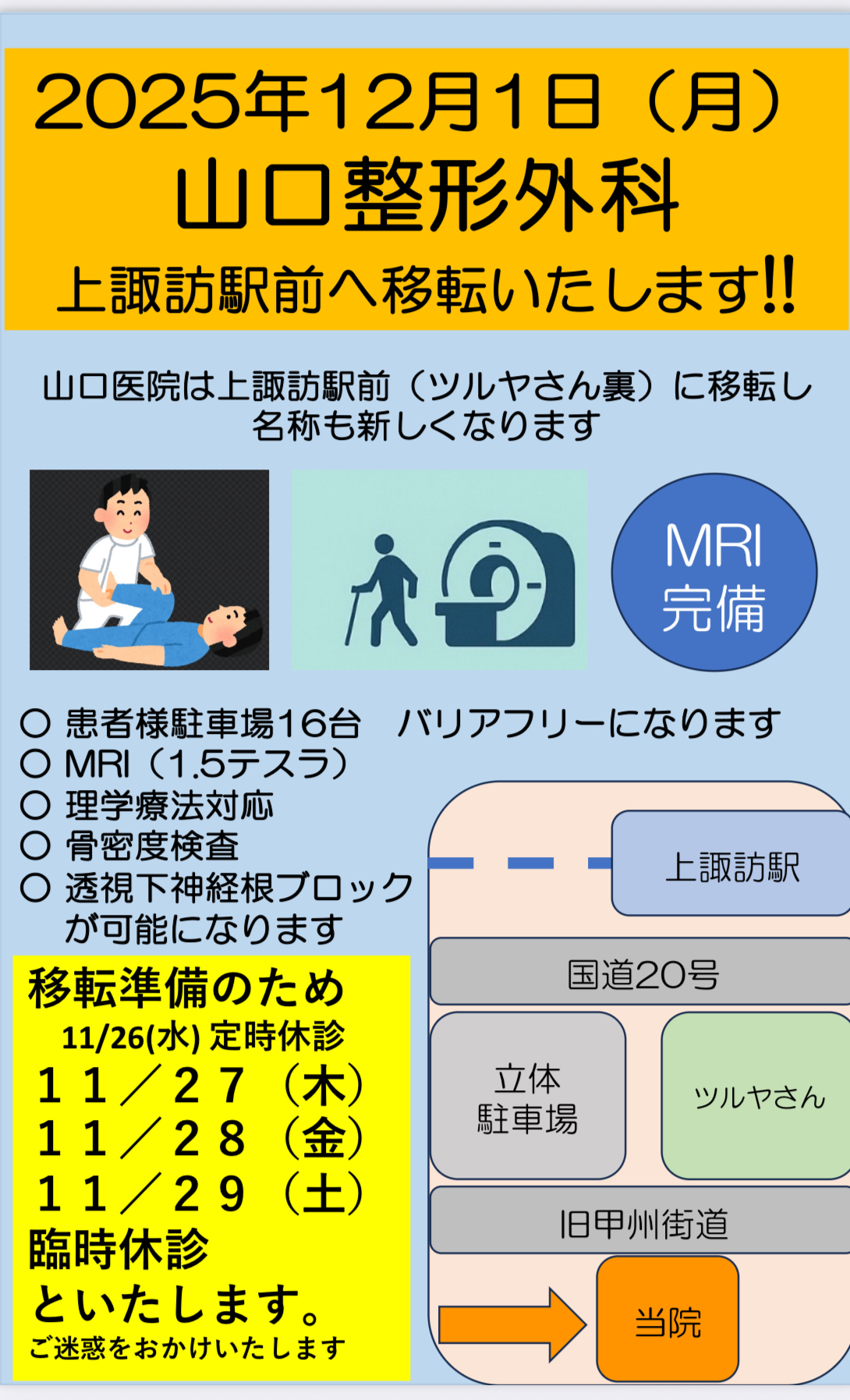 2023年秋より副院長が診療に加わりました。2025年12月には上諏訪東口駅前(徒歩2分)に移転いたします。MRI、レントゲン透視装置、骨粗鬆症検査が可能になります。また2階には理学療法・作業療法・物理療法を行えるリハビリテーション室を確保いたします。